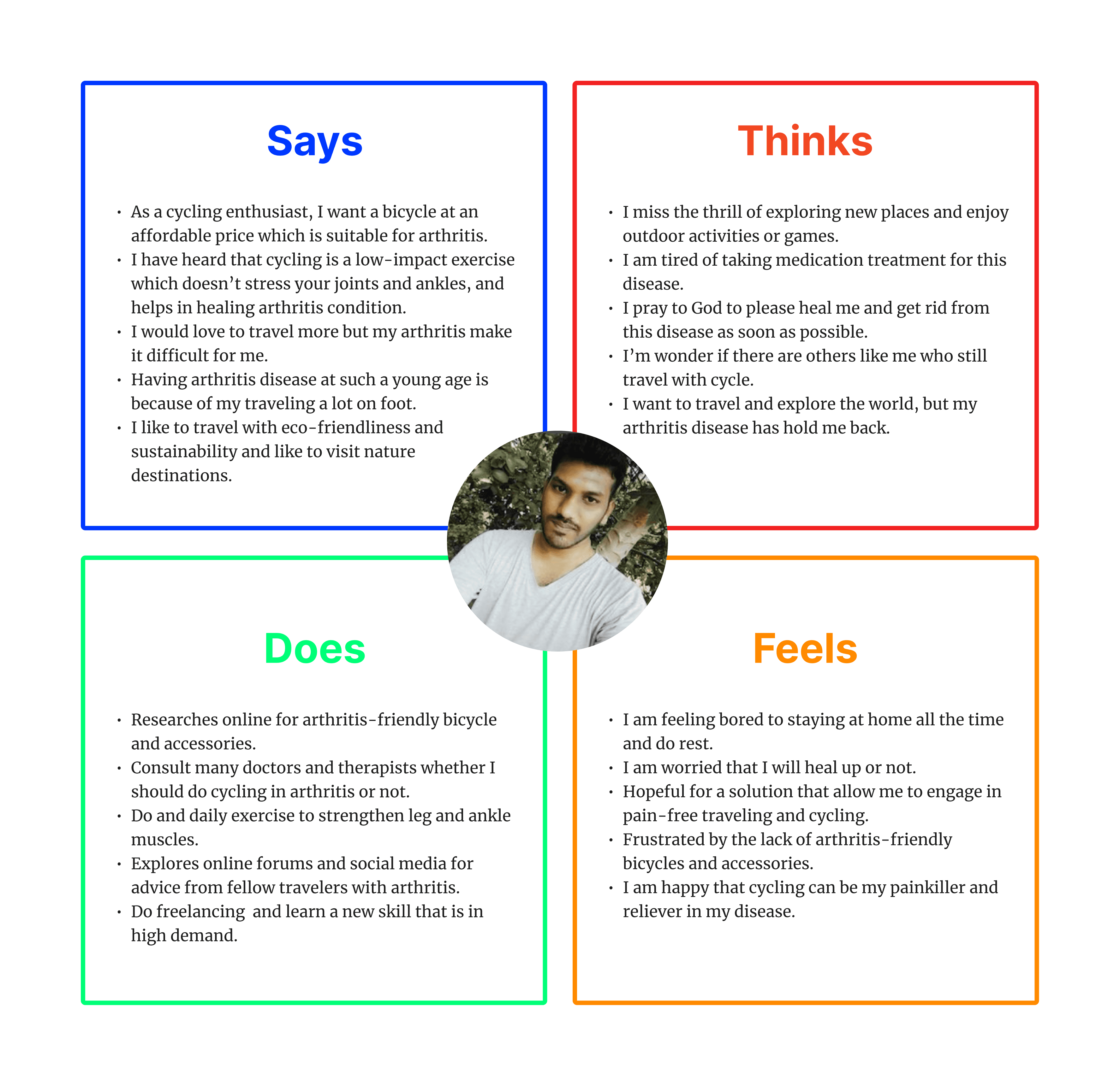 Through my interactions, I constructed an empathy map, divided user pain points and aspirations into four sections- Says, Thinks, Does and Feels. Shaurya's empathy map, for instance, vividly highlighted his struggle with limited mobility due to ankle pain. Insights like this became the emotional compass guiding app's design.
