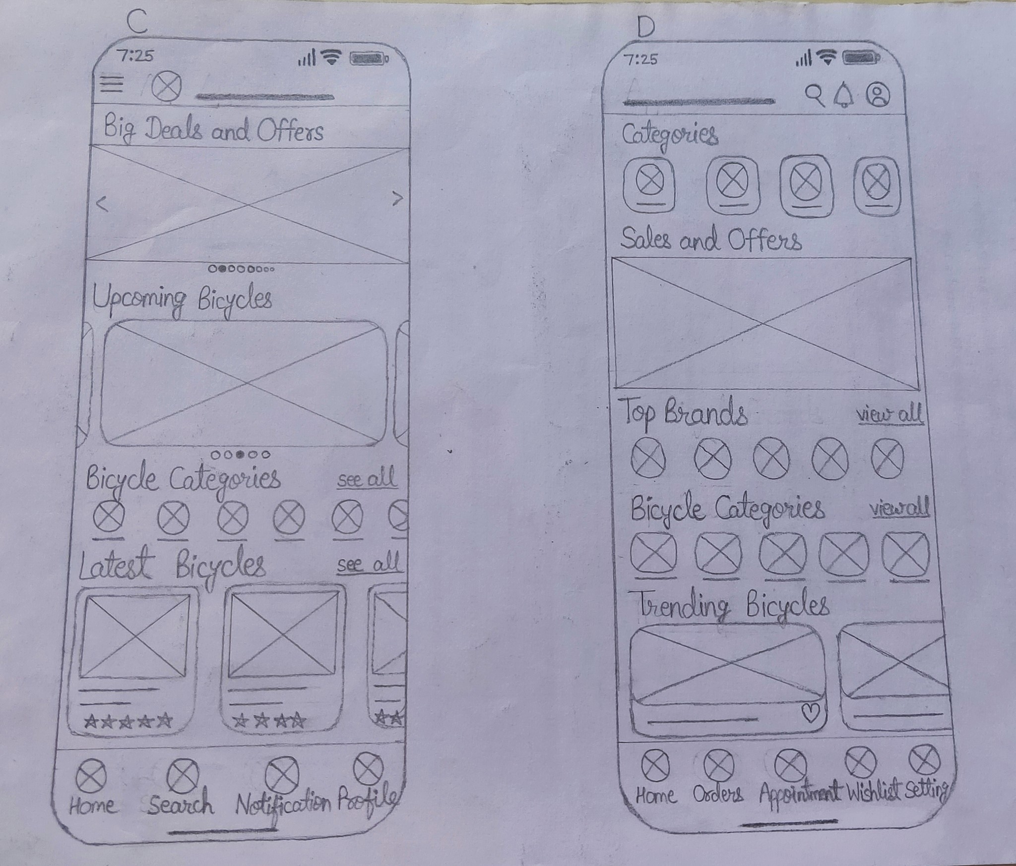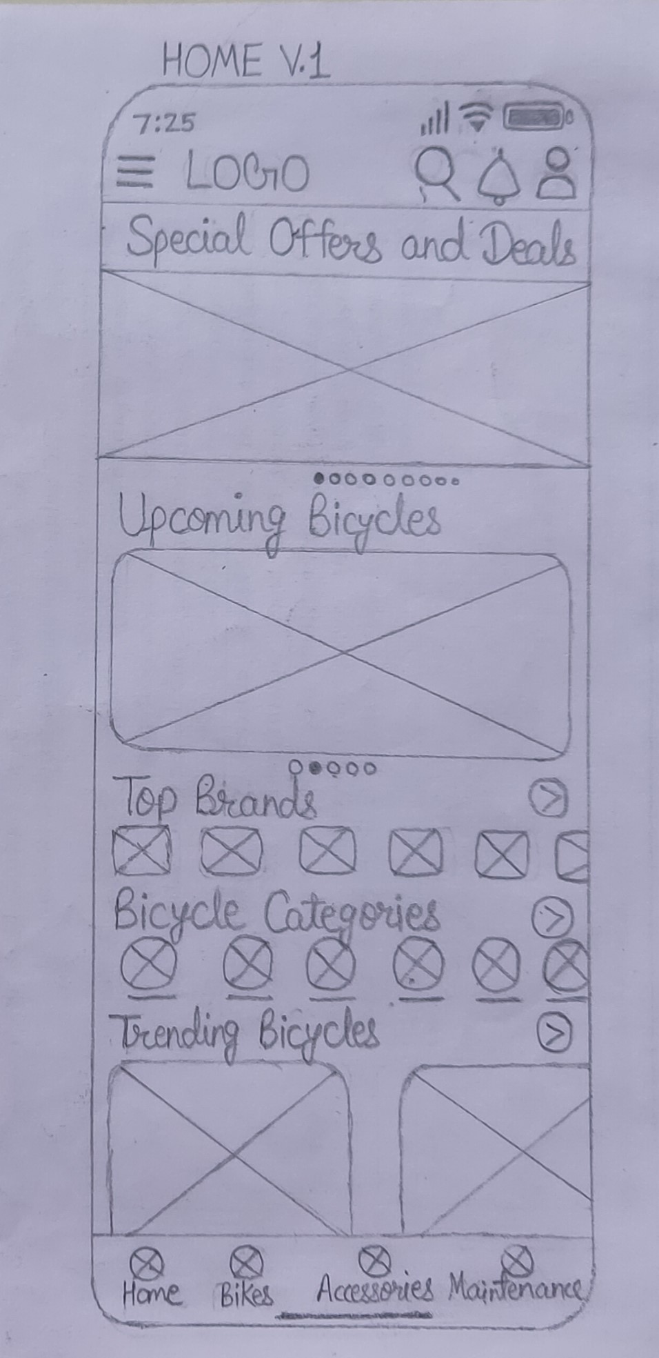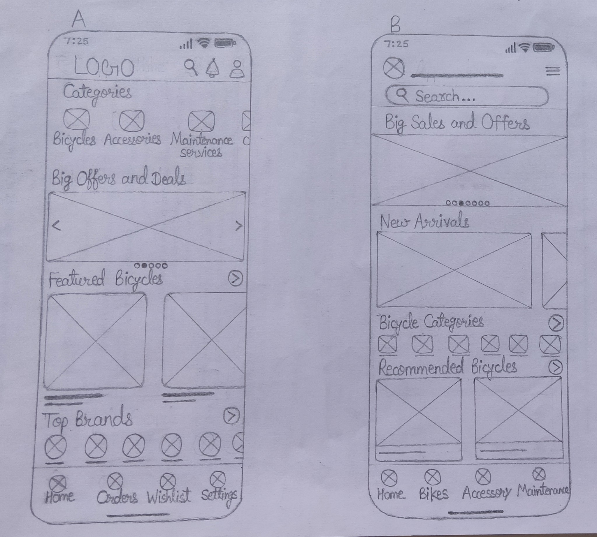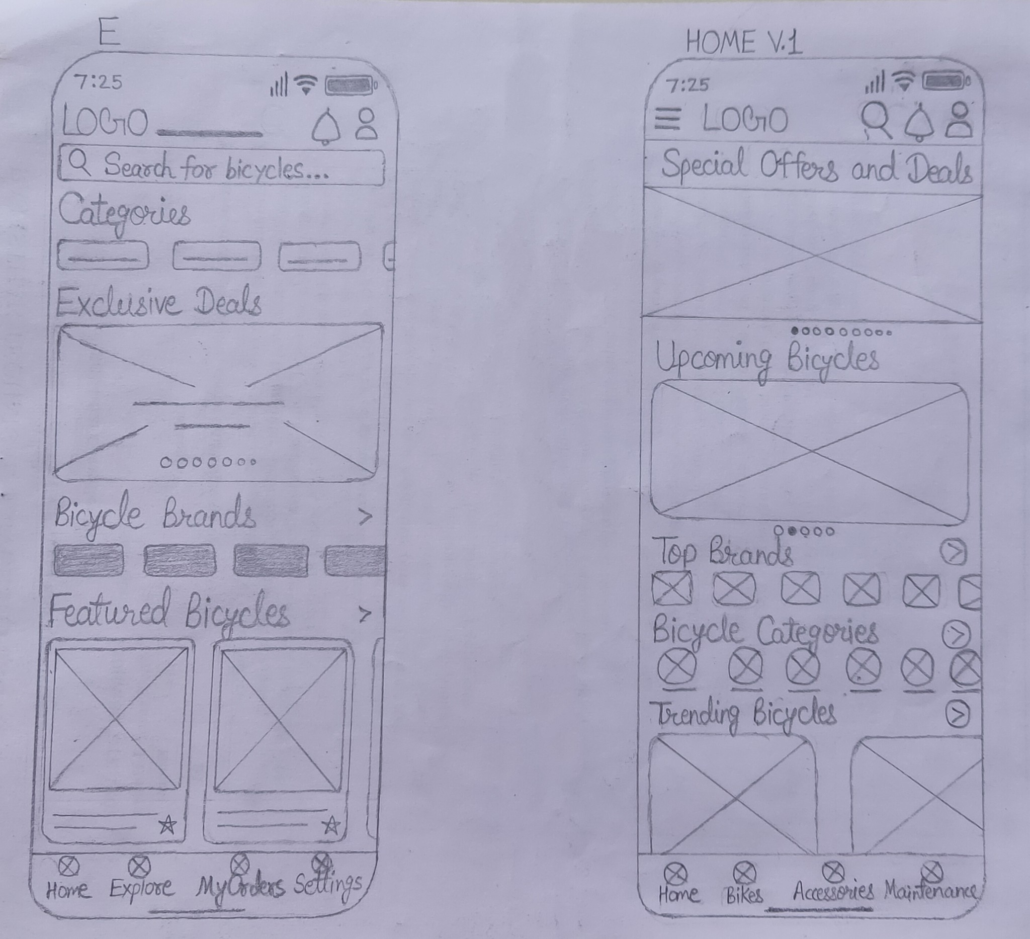 With sketches in hand, I transitioned to paper wireframes. The emphasis was on simplicity, ensuring even the less tech-savvy users could navigate effortlessly, I make five simple paper wireframes- A, B, C, D & E and one refined wireframe-Home v.1. These home screen blueprints served as the foundation of my digital journey.