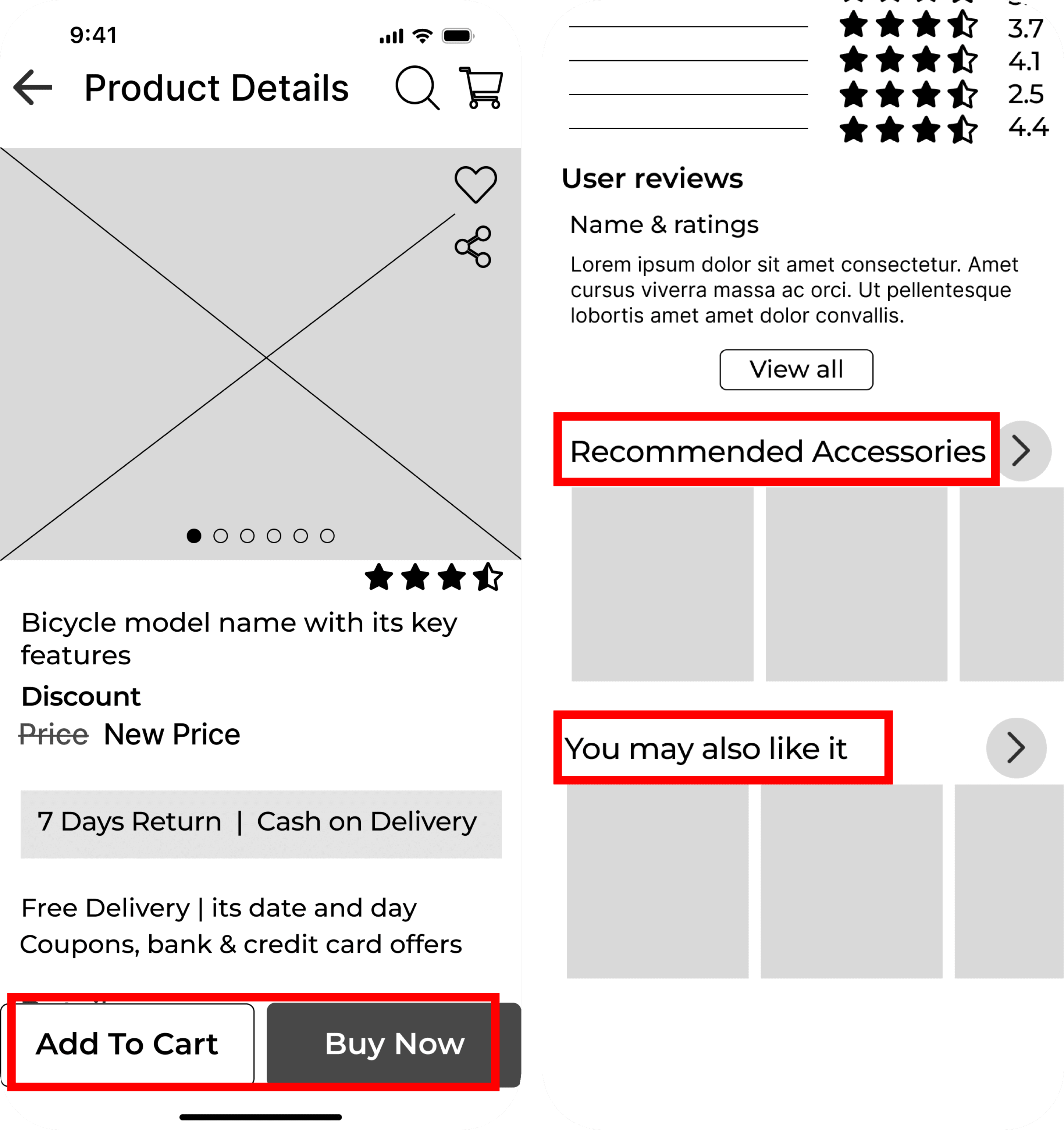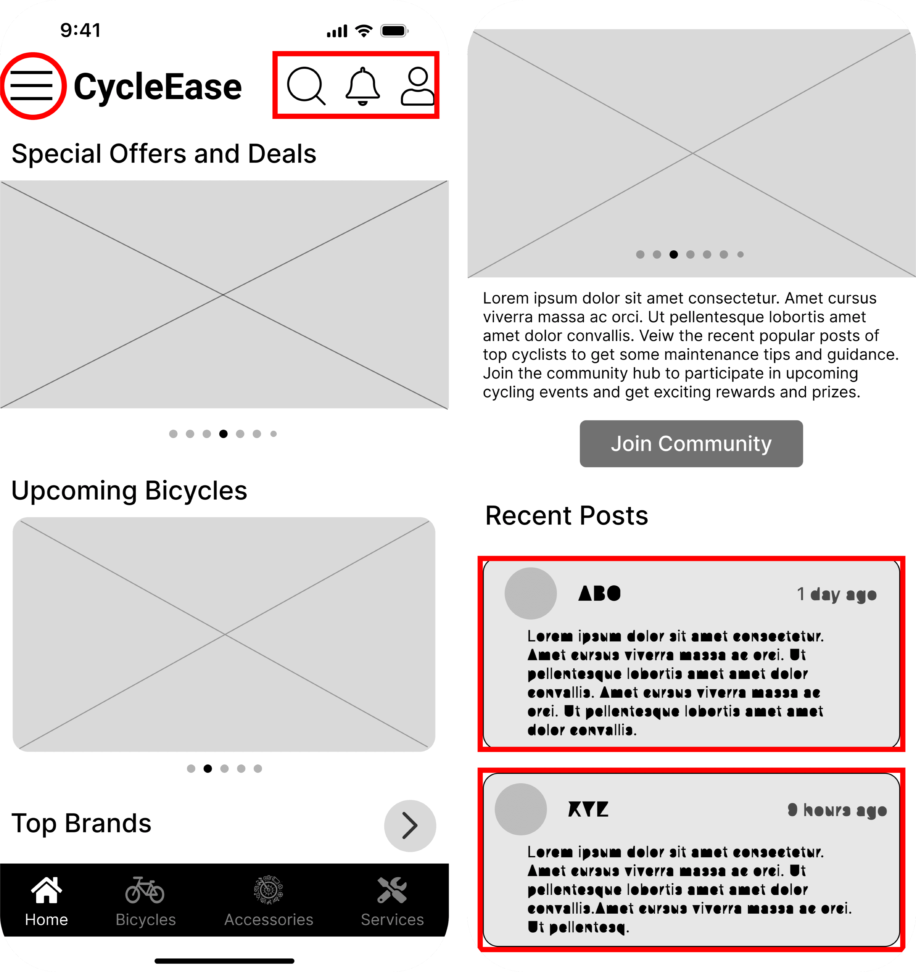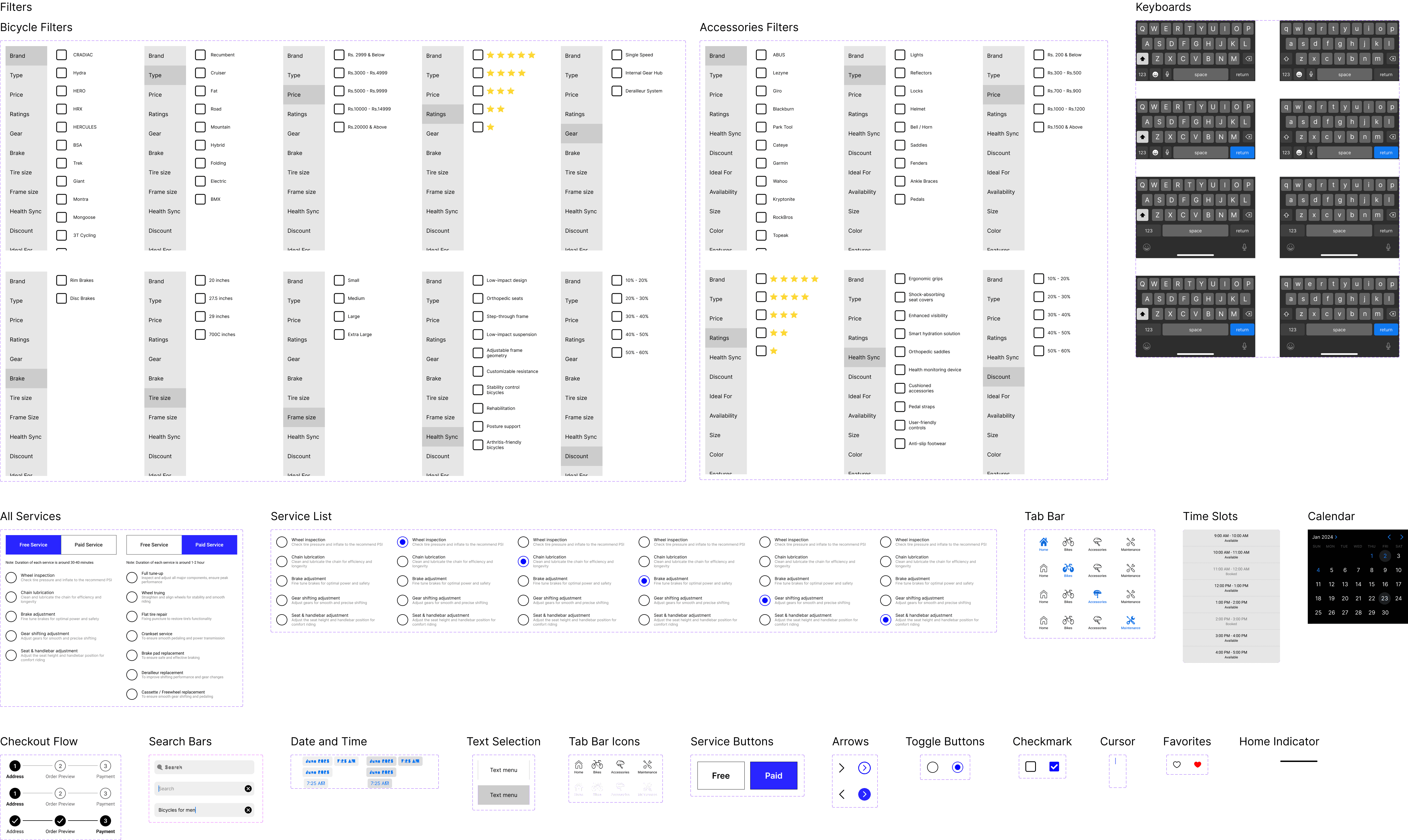 With a wealth of data at our fingertips, I crafted a clear and intuitive information architecture. Clear hierarchies ensured that users like Shaurya and Arnav could effortlessly navigate from selecting a bicycle to joining a community ride. The skeletal structure of the app is devised, with a focus on intuitive navigation.