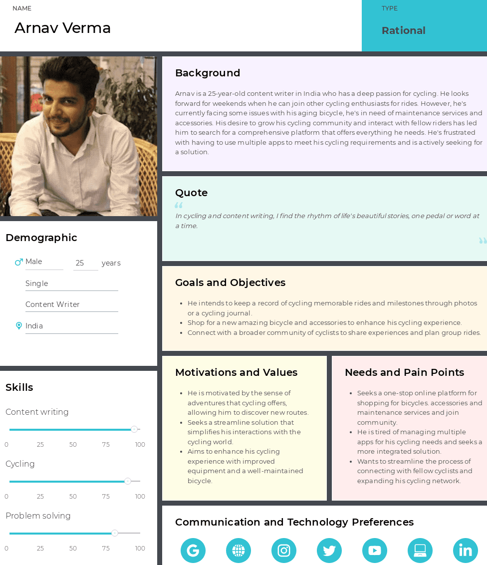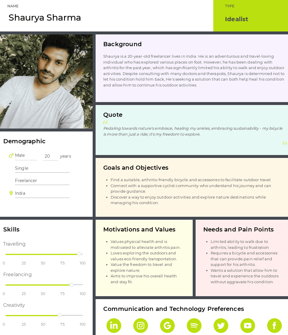 To understand the diverse needs of potential users, a series of interviews were conducted in qualitative research. During this research, I conducted interviews of 7 potential participants including kids, teens, adults and seniors. I navigated the unique perspectives of health patients, bicycle enthusiasts and seasoned cyclists. I prepared an interview script with 20 open-ended questions, focusing on our target audience's needs, pain points and challenges.