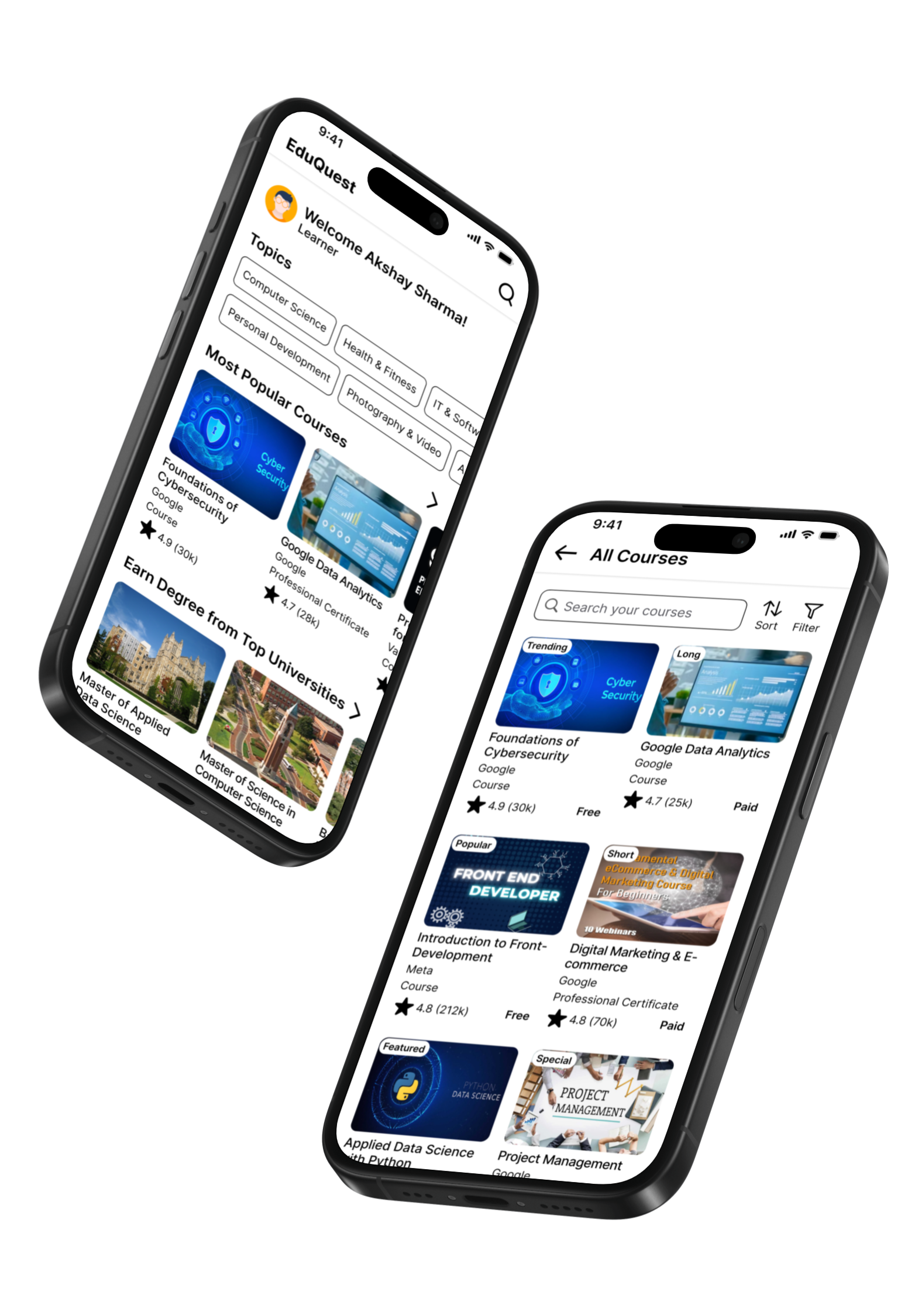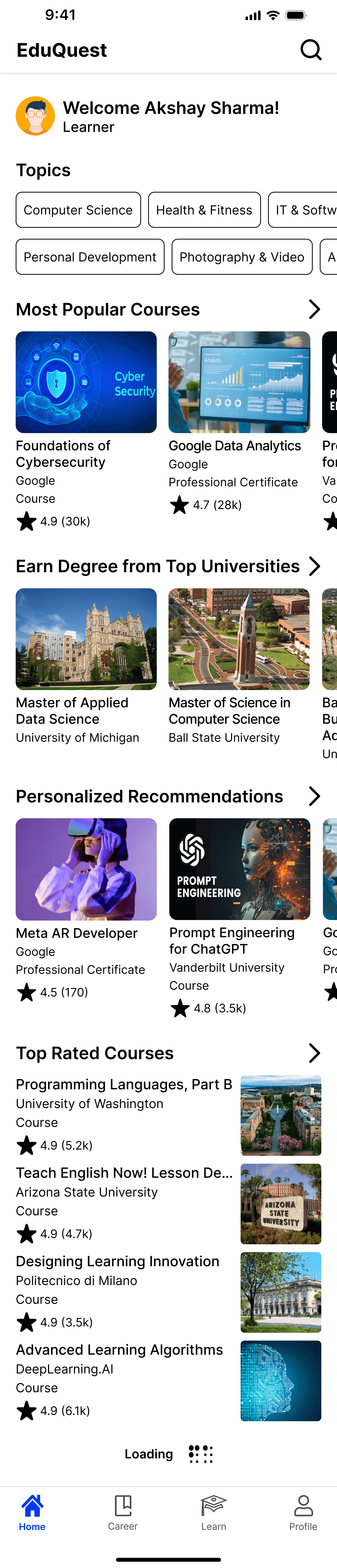 Personalized Dashboard: Displays ongoing courses and personalized course recommendations based on user goals.